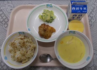 ツナピラフ 牛乳 タンドリーチキン グリーンサラダ コーンスープ てづくりかぼちゃプリン
