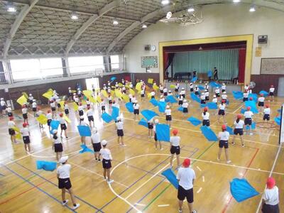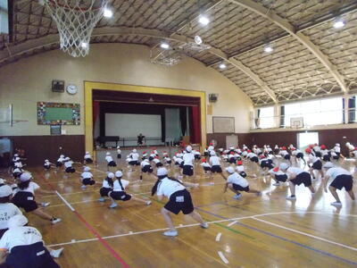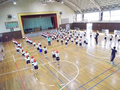 昨日から運動会練習が始まりました。まだ外は暑いので、体育館で基本的な動きの確認からです。
