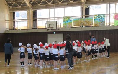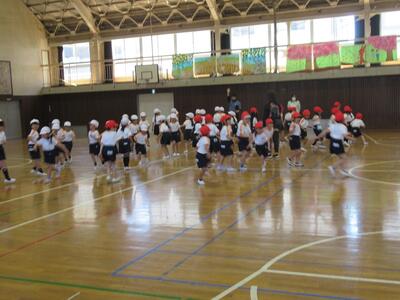 1年生が体育館で1・2組合同の体育をしました。