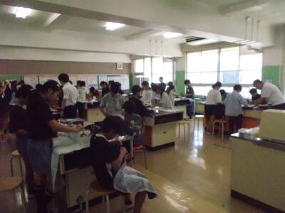 5年生の家庭科ではミシンを使ってエプロンを作っています。初めてのミシンに苦戦している5年生ですが、多くの保護者の方(お父さん、お母さん)にお越しいただいてサポートしていただいています。2時間ずつ2クラス家庭科が続いていることもあって、自分のお子さんがいないクラスの方も見ていただいている方もいて、とても助かっています。