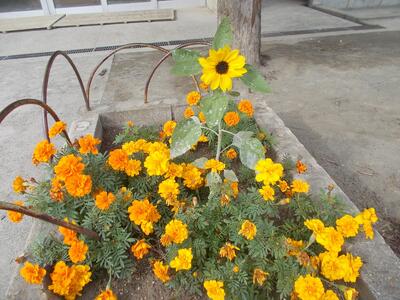 これは、夏に咲いたひまわりの種がこぼれて芽が出たものです。周りのマリーゴールドもこぼれ落ちた種が芽を出したものです。水やりさえ欠かさなければきれいな花が咲いてくれる、とてもありがたい花壇です。