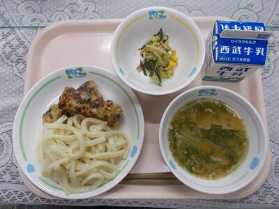 ごまみそうどん 牛乳 ちくわのいそべあげ くきわかめのサラダ