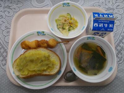 スイートポテトトースト 牛乳 うずらのたまごくしフライ れんこんチップサラダ ABCスープ