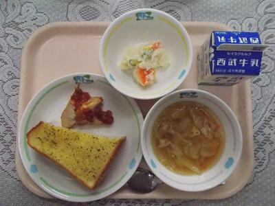 ガーリックトースト 牛乳 とりにくのトマトソースがけ ポテトサラダ ABCスープ