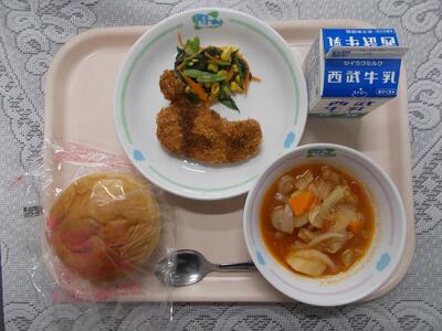 はちみつパン 牛乳 とりささみフライ ミネストポトフ ほうれんそうサラダ