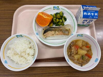 ごはん 牛乳 サケのみそマヨネーズやき ピリからきゅうり じゃがいものそぼろに せとか