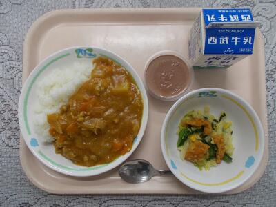 チキンカレーライス 牛乳 パリパリサラダ てづくりココアプリン
