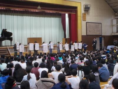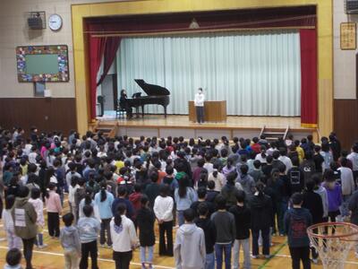 3月の全校朝会 投稿: 富岡小 (10:38) カテゴリー: 全校での活動 今日は朝の活動の時間に全校朝会を行いました。生活目標の話では、4年生が登場して1年間の生活目標の振り返りをしました。また、インフルエンザの流行で音楽朝会ができなかったので、短い時間でしたが、6年生の指揮と伴奏に合わせて歌いました。